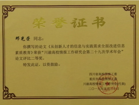 大会学术交流期间,上海交通大学图书馆研究馆员黄镝等8位专家分别以双一流形势下资源建设策略与绩效分析、川渝高校情报工作研究会30回顾、数据与智慧图书馆、学科服务中的自信与他信、嵌入式学科服务实证案例、“双一流”视角下图书馆建设的几点思考等为题作了8个主题报告和专题报告,还有6位作者进行了论文或案例分享交流。本次会议共收到51篇论文,本馆邓光荣老师提交的《从创新人才的信息与实践需求全面改进信息素质教育》荣获优秀论文二等奖。