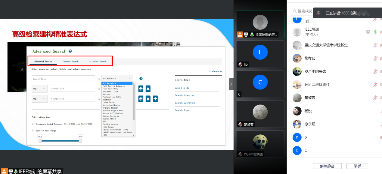 为了我校师生更加高效的使用IEEE数据库平台,5月14日晚上,由我校图书馆主办、信息学院协办的“IEEEXplore高效检索、文献调研及热点追踪”主题讲座在线上举行,线上多人参加了此次讲座。