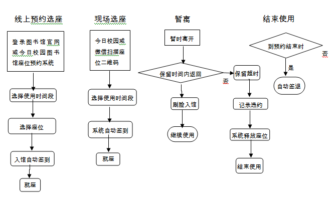 3.读者暂时离馆请在座位预约系统点击“暂离”,座位保留30分钟(用餐特定时间段11:00-13:00、17:00-19:00座位保留120分钟,若预约结束时间在用餐特定时间段内则以预约结束时间为准),返回时须通过门禁刷脸进馆。