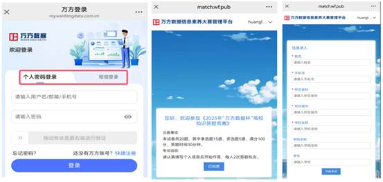 2、点击进入后,选择“个人密码”或“短信登录”,不可以第三方登入。进入答题系统,填写姓名、电话、所在省份及学校全称等个人信息后在相应的时间段内即可开始答题。(注意:个人信息需确保准备无误,否则无法导出,视为无效成绩。)