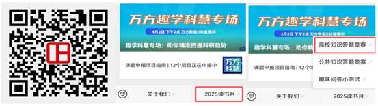 1、微信扫码并关注“万方数据”公众号,点击“2025读书月”菜单栏,选择“高校学习知识竞赛”。