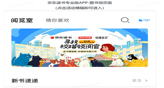 为响应世界读书日,营造良好的校园阅读氛围,图书馆联合京东读书专业版数据库开展“校猫”公益读书活动。通过阅读传递爱心,为校猫筹集猫粮,同时提升我校师生的阅读素养。