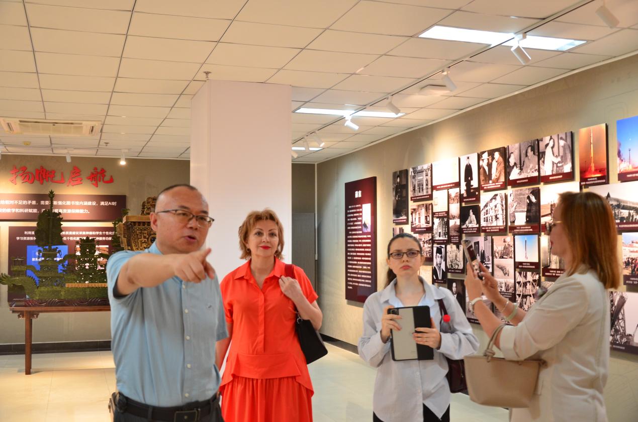 代表团首先参观了图书馆一楼的明德书斋,详细了解了数字人交互系统和AI智能书架等现代化服务设施。随后,代表团前往二楼的钱学森科学精神与教育思想展厅,石超峰馆长向俄方嘉宾深入解读了钱老的科学精神与教育理念,引起强烈共鸣。在四楼的图书馆文化展厅,刘良璧副馆长详细介绍了图书馆的发展历程、首任馆长事迹及本馆珍贵历史藏品,嘉宾参观了重庆市交通文化特色展柜,深入感受山城交通文化的独特魅力,嘉宾表现出浓厚兴趣。此外,代表团还实地考察了图书馆各楼层的借阅区、自习空间及“两小时周转特色自习区”等。