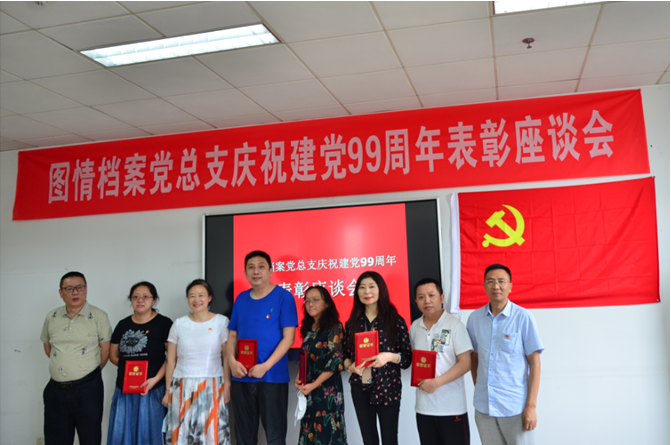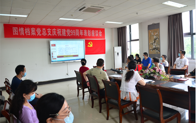 在党的生日来临之际,为庆祝中国共产党99周年诞辰,表彰先进,进一步激励广大党员不忘初心、牢记使命,激发爱党爱国之情,发挥党员先锋模范作用,7月3日上午,图情档案党总支在图书馆二楼会议室召开庆祝建党99周年“七一”表彰座谈会,图情档案党总支全体党员参加了座谈会。